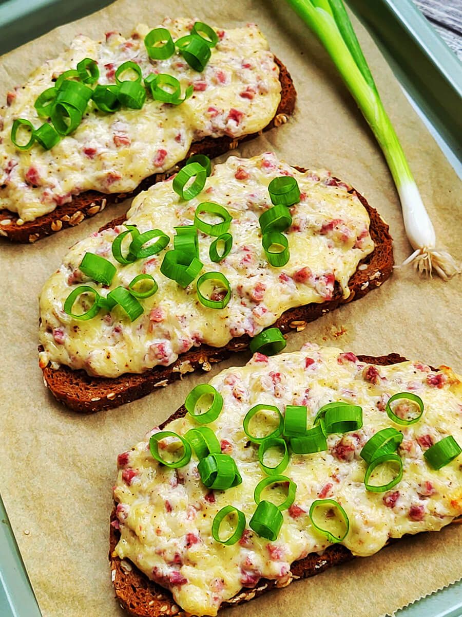- Die Brotscheiben auf ein Backblech geben und die Schmandmasse darauf verteilen
